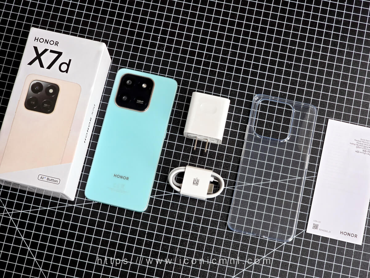 The HONOR X7d comes in a clean and simple box, and inside you will find everything you need to start using the phone right away. Aside from the smartphone itself, the package includes the 35W HONOR SuperCharge power adapter, a USB-A to USB-C charging and data cable, the SIM ejector tool, and the usual documentation such as the quick start guide and warranty papers.