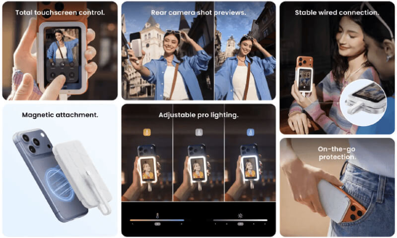 With this mirrored display, users can clearly monitor their position, camera angle, and background while filming. This enables creators to use the higher-quality rear cameras found on modern smartphones while still seeing themselves on screen.