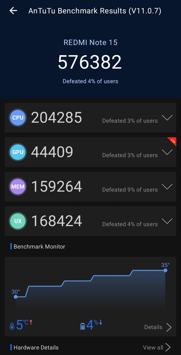 To better understand how the REDMI Note 15 performs in daily use, we ran several benchmark tests that simulate real-world tasks such as multitasking, system navigation, and graphics handling. In the AnTuTu Benchmark, the device scored 576,382, reflecting balanced overall performance. The CPU score of 204,285 shows that the phone can comfortably handle everyday activities like browsing, messaging, and switching between apps. The GPU score of 44,409 indicates stable graphics performance for casual gaming and animations, while the memory score of 159,264 highlights efficient handling of apps running in the background. The UX score of 168,424 represents smooth system navigation and responsive interactions.