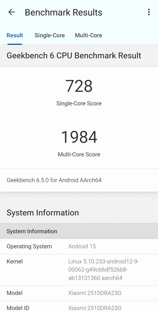 We also ran Geekbench, which focuses on processor performance. The REDMI Note 15 achieved a single-core score of 728, which translates to quick responses when opening apps or performing simple tasks. Its multi-core score of 1,984 reflects the phone’s ability to manage multiple processes at once, supporting smooth multitasking during daily use. These results help explain why the device feels stable and responsive even when several apps are open.