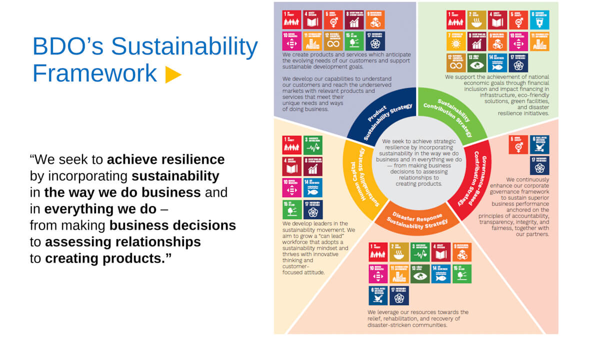 Marla Garin-Alvarez, BDO First Vice President and Head of the Sustainability Office, shared that “We seek to achieve resilience by incorporating sustainability in the way we do business and in everything we do, from making business decisions to assessing relationships to creating products.”