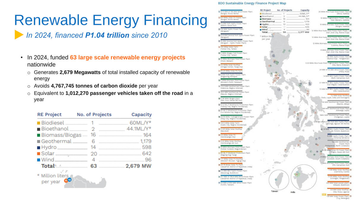Since 2010, BDO has financed ₱1.04 trillion in renewable energy projects across the country. These 63 large-scale projects generate 2,679 megawatts of clean energy capacity and prevent 4,767,745 tonnes of carbon dioxide emissions each year. That is equivalent to taking over one million cars off the road.